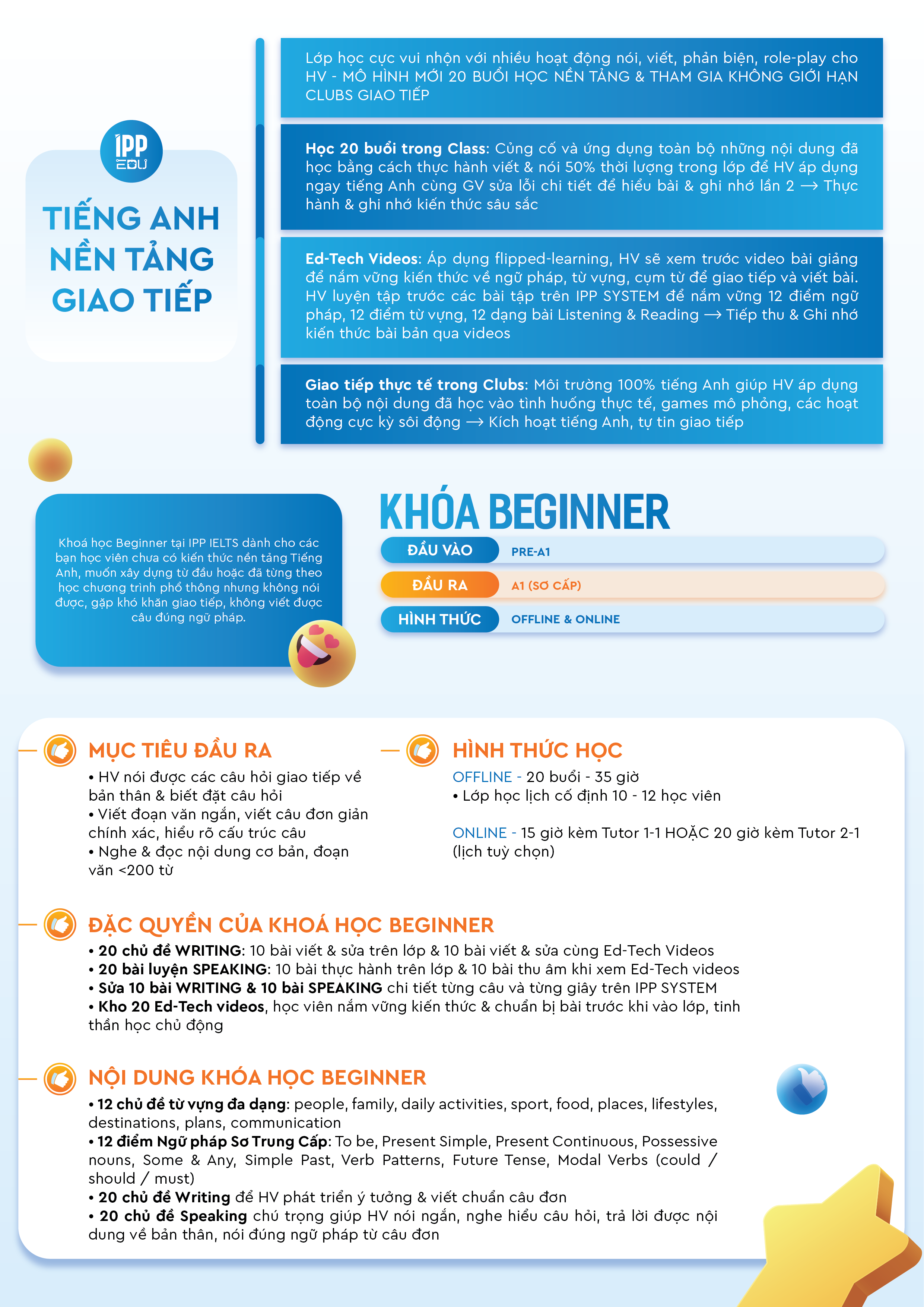 Khoá học Beginner tại IPPEdu dành cho các bạn học viên chưa có kiến thức nền tảng Tiếng Anh, muốn xây dựng từ đầu hoặc đã từng theo học chương trình phổ thông nhưng không nói được, gặp khó khăn giao tiếp, không viết được câu đúng ngữ pháp.